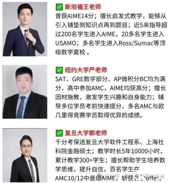 犀牛AMC竞赛培训师资有多年国际竞赛培训经验,对AMC8/10/12竞赛备考要点掌握的炉火纯青,能够授之以渔,教会学生数学竞赛备考核心方法。