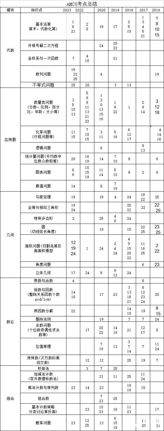 AMC8竞赛考察内容不仅包含小学数学知识,还涉及部分初中数学知识,如代数、几何(特别是结合平面直角坐标系、比例、列方程解题、相似三角形的性质等)、数论和组合等。但是,通过系统学习和补充,这些知识点是可以被掌握的。