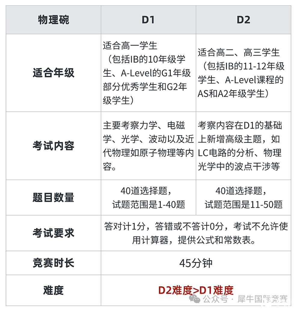 虽然物理碗竞赛D1和D2是在一套试卷中,但是题目难度是逐渐增加的。前10题,基础题,难度低,11-40题是D1和D2试卷的共同考察题目,后10题,难题,会考察电磁学、力学、热学、光学以及相对论等难度较大的知识。