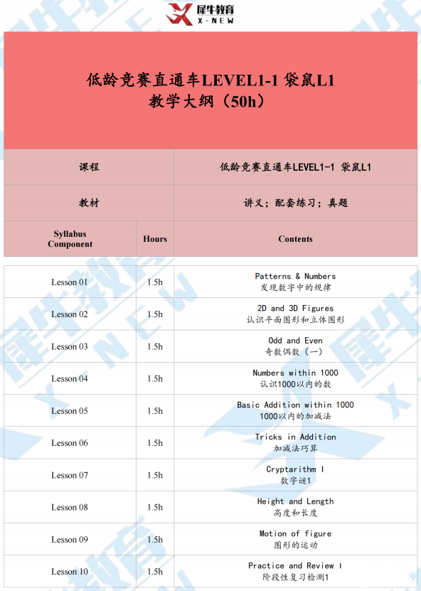 袋鼠L1课程内容:讲解袋鼠数学竞赛L1阶段的考试内容,以激发孩子的数学兴趣为主,掌握最简单的运算知识和技巧。