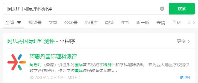或者微信搜索“阿思丹国际理科测评”小程序进行查询