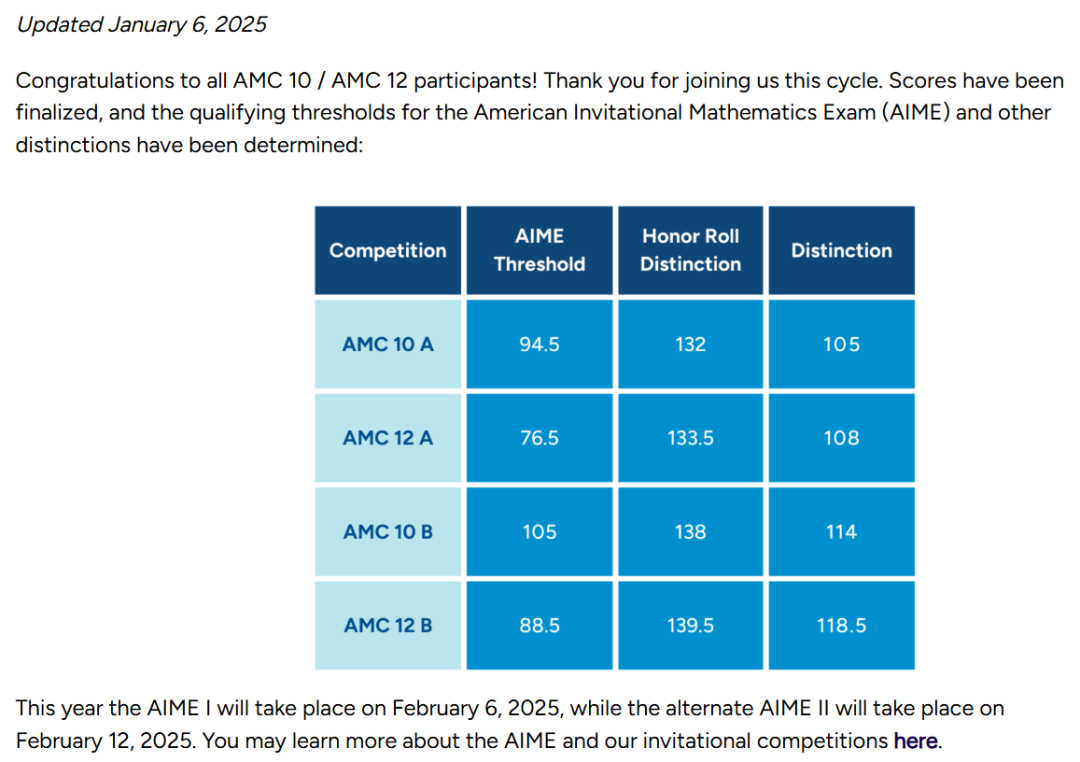 MAA最新消息:2025AIMEⅠ不对海外开放,因此中国区取消举办。AIME Ⅱ(2025年2月13日)正常举办,试卷语言暂定:英语