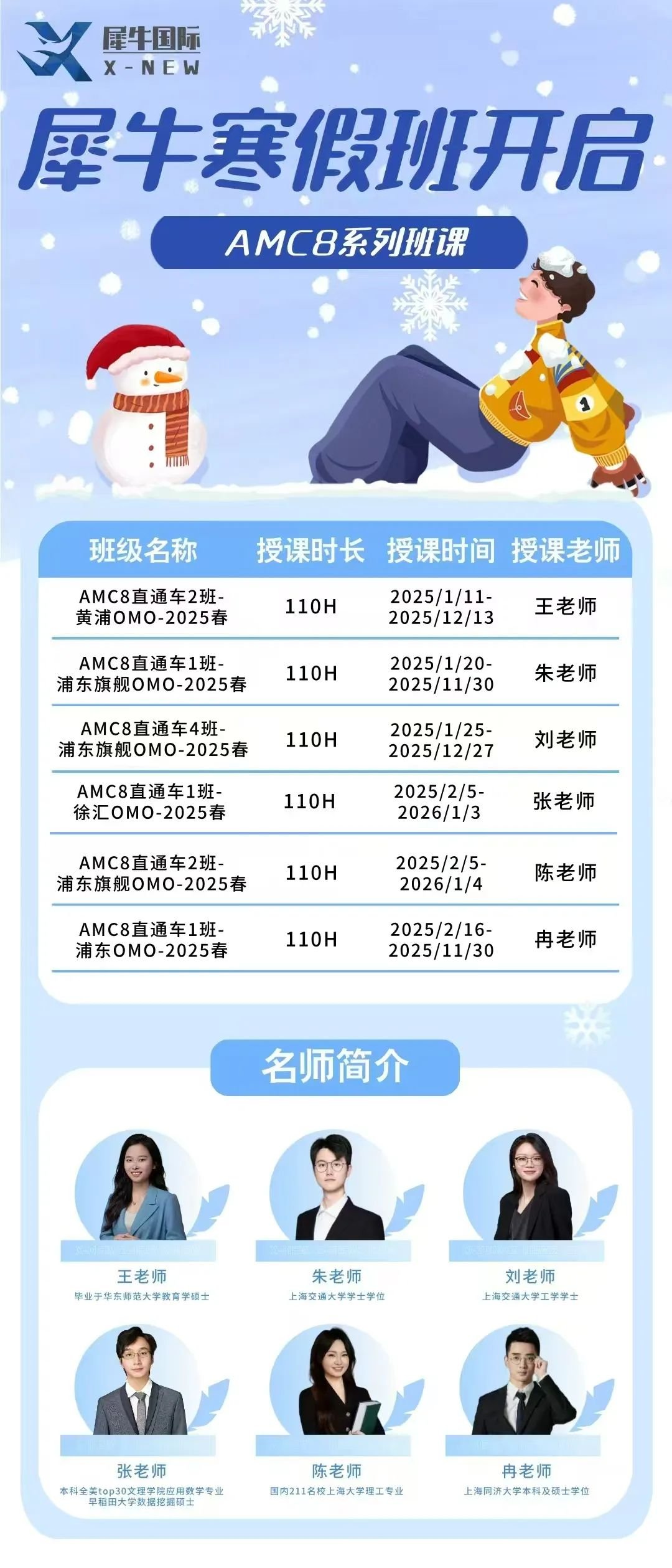 犀牛AMC8数学竞赛寒假培训课程分为Pre-AMC8课程、基础班、强化班、冲刺班等不同阶段班级。