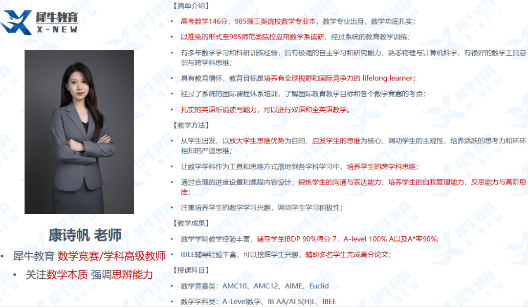 犀牛AMC10的老师都是由清华大学、北京大学、复旦大学、上海交通大学、芝加哥大学、纽约哥伦比亚大学、莱斯大学、墨尔本大学等美国TOP30.英国G5的国内外一流大学的博士、硕士背景的老师,老师们都有丰富的国际竞赛教学经验。