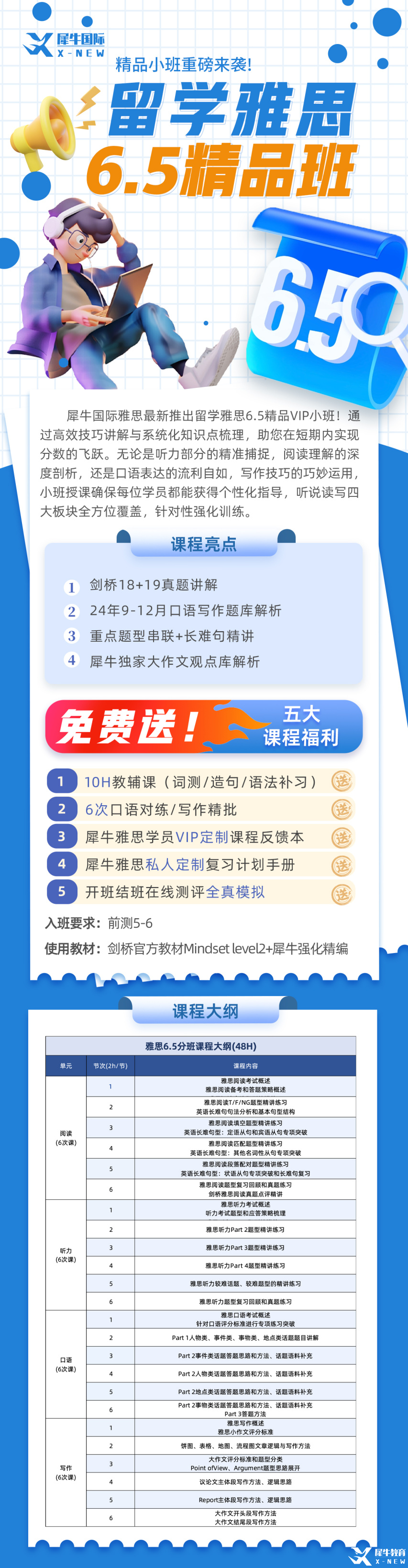 犀牛根据不同学员英语水平的差异,开设了一系列丰富多元的雅思培训课程,全方位覆盖从基础夯实到高阶提升的各个关键阶段,具体包括Pre雅思衔接培训课程、雅思5.5分特训班、雅思6.5分特训班/精品班、雅思7.5分精品班,针对不同水平同学进行相应课程安排,助力烤鸭们高分通过!