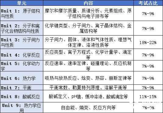 AP化学课程内容分为9个主要单元,每个单元在考试中所占的比重有所不同,如图所示: