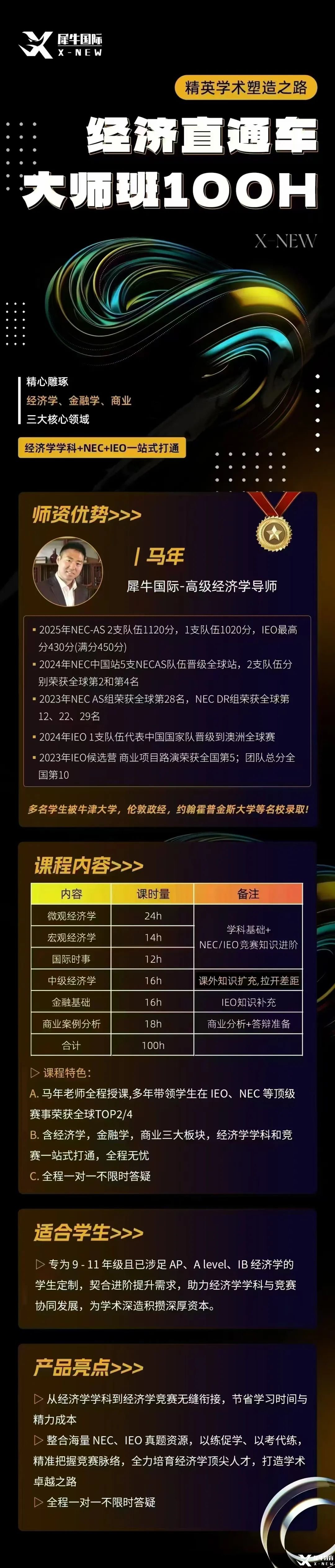 专为9-11年级且已涉足 AP、Alevel、1B 经济学的学生定制,契合进阶提升需求,助力经济学学科与竞赛协同发展,为学术深造积攒深厚资本。