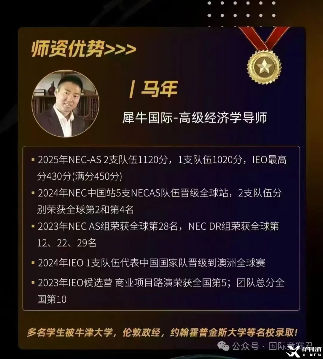 5、课程提供全程一对一答疑和名师指导,马年老师的学生在NEC/IEO中屡获全球前4名,解决学生个性化问题,尤其适合需要突破学科瓶颈或竞赛复杂题型(如IEO的政策分析)学员。