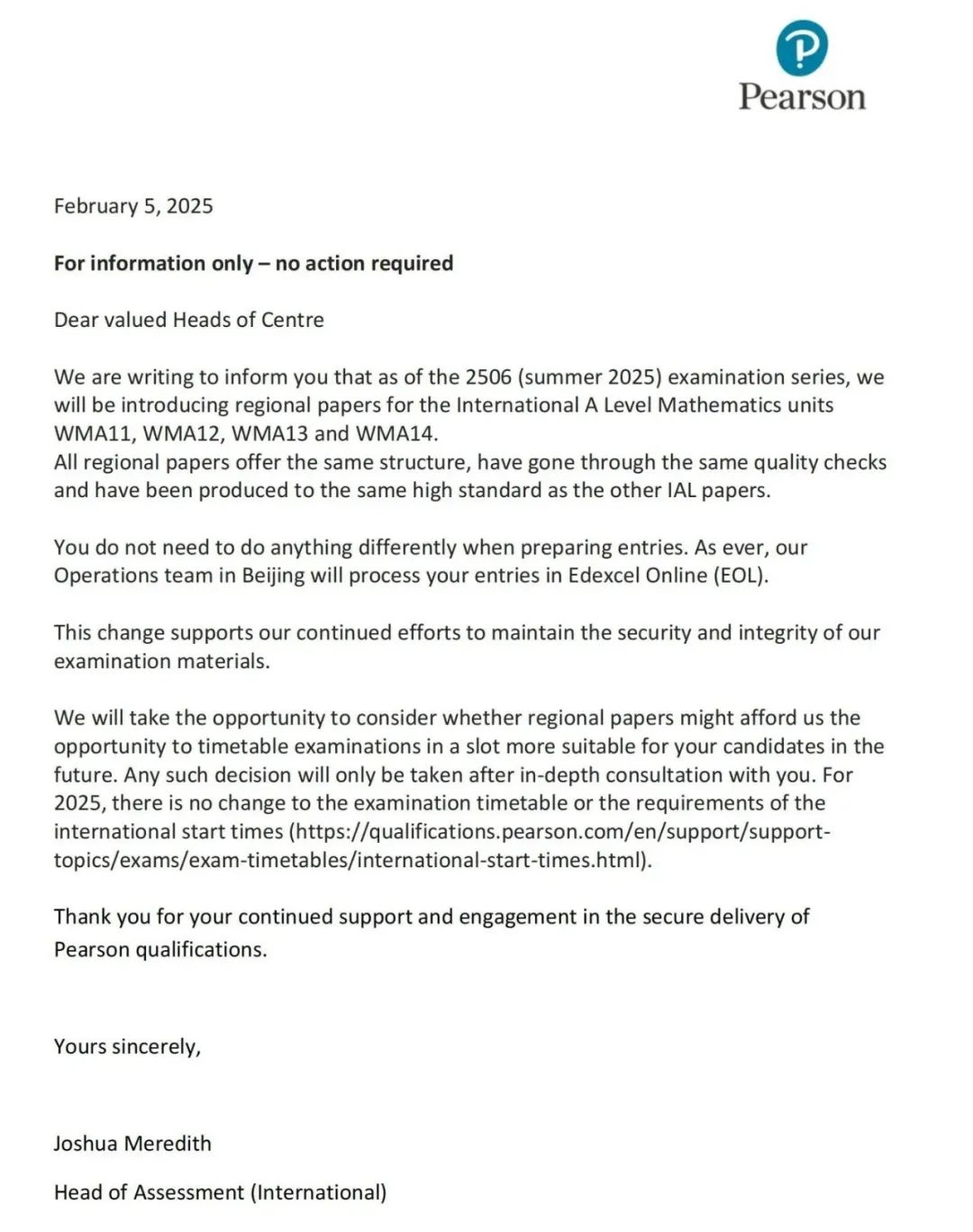 2025年夏季起,中国考区A-Level数学科目(P1/P2/P3/P4)全面启用区域试卷。