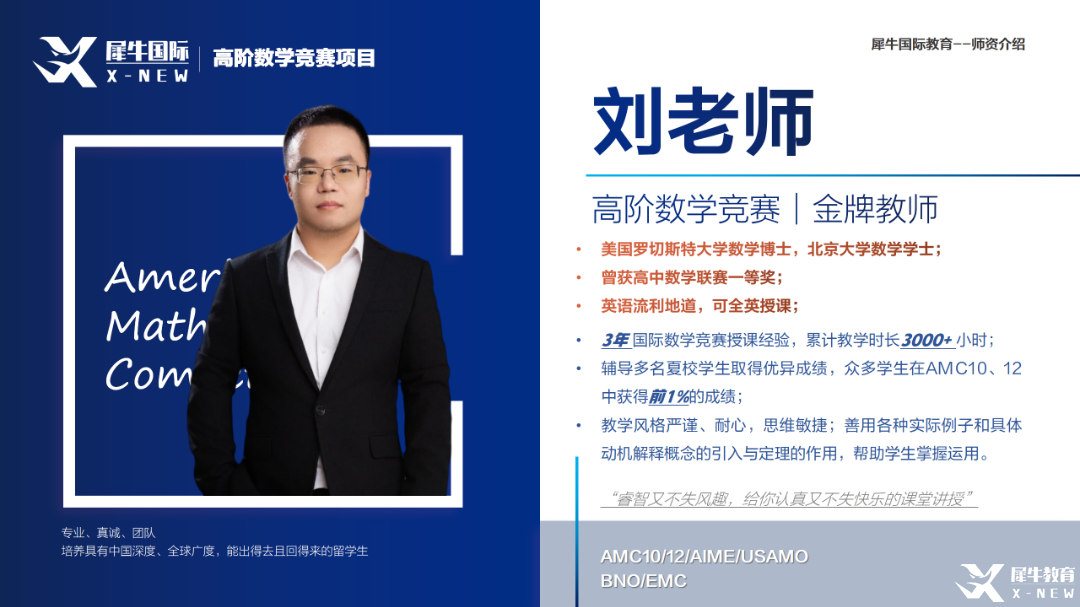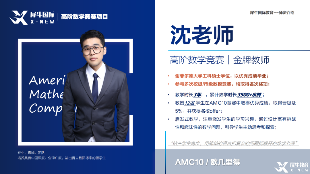 AMC10竞赛难度相当于国内初中联赛的水平,十年级以下的同学备考AMC10还是有一定难度的,今天犀牛老师给大家推荐AMC10长线备考培训课程,帮助大家更好地备考!
