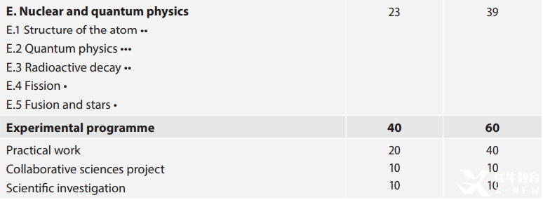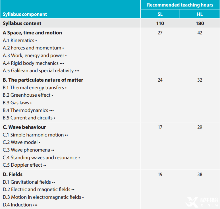 IB物理共分为五个主题。其中标“.”的是需要给所有学生教授的内容,标“..”的是主题包含所有学生需要学习的课程内容及额外的HL课程内容;标“...”的是只给HL学生教授的课程内容