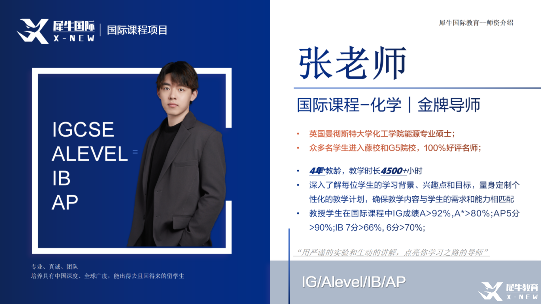 犀牛教育教师团队由海内外名校背景的博士、硕士组成,兼具学术深度与教学经验,擅长将复杂理论转化为生动案例,多位教师曾指导学生斩获UKCHO、CCC等国际化学竞赛奖项,助力学术背景提升!犀牛化学牛师带你突破IG化学瓶颈,轻松冲刺A*!