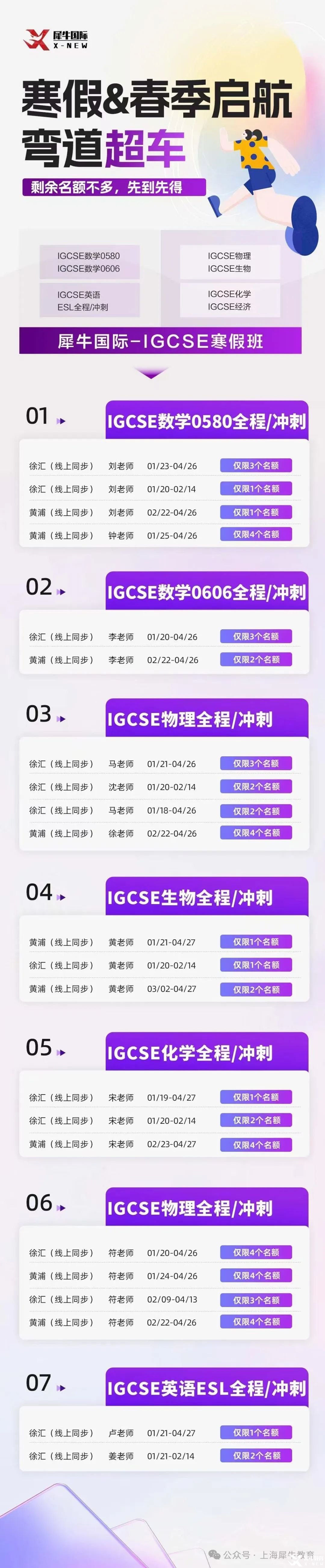 犀牛国际教育针对IGCSE课程开设了数学、英语、生物、化学、物理等全程/冲刺班,助力学生提升之路!