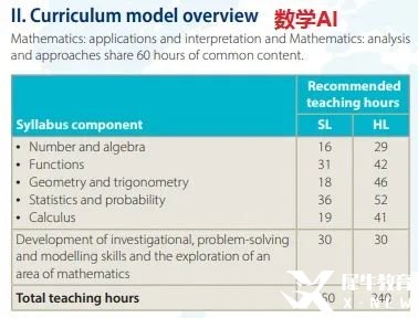 如果仅从课程大纲方面上来看,IB数学AA和数学AI两门课程的Topic内容相差不多。涉及的内容都包括5个Topic,分别是:① Number and Algebra (数与代数)② Functions(函数)③ Geometry and Trigonometry (几何与三角)④ Statistics and Probability (统计与概率)⑤ Calculus (微积分)