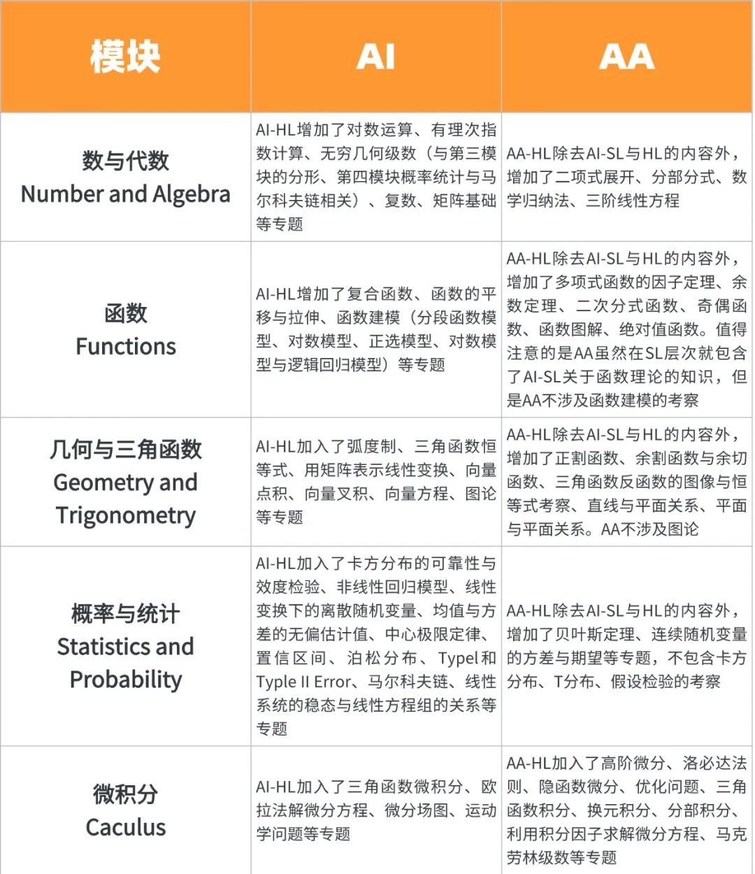 在知识点的学习上,数学AA和数学AI有五个相同的模块,但每个模块下的知识点有所不同,具体内容如下:
