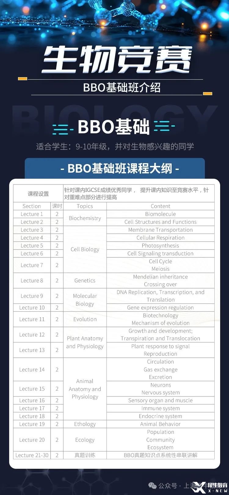 BBO考试内容为AP生物、美国生物课程、大学General Biology内容,专业性较强;总体分为6大类:动物解剖学和生理学(25%)、细胞生物学(20%)、植物解剖学“及生理学(15%)、遗传与进化(15%)、生态学(15%)、生物分类(5%)、动物学(5%)。值得注意的是,今年还新增了神经生物学和生物信息学的内容。
