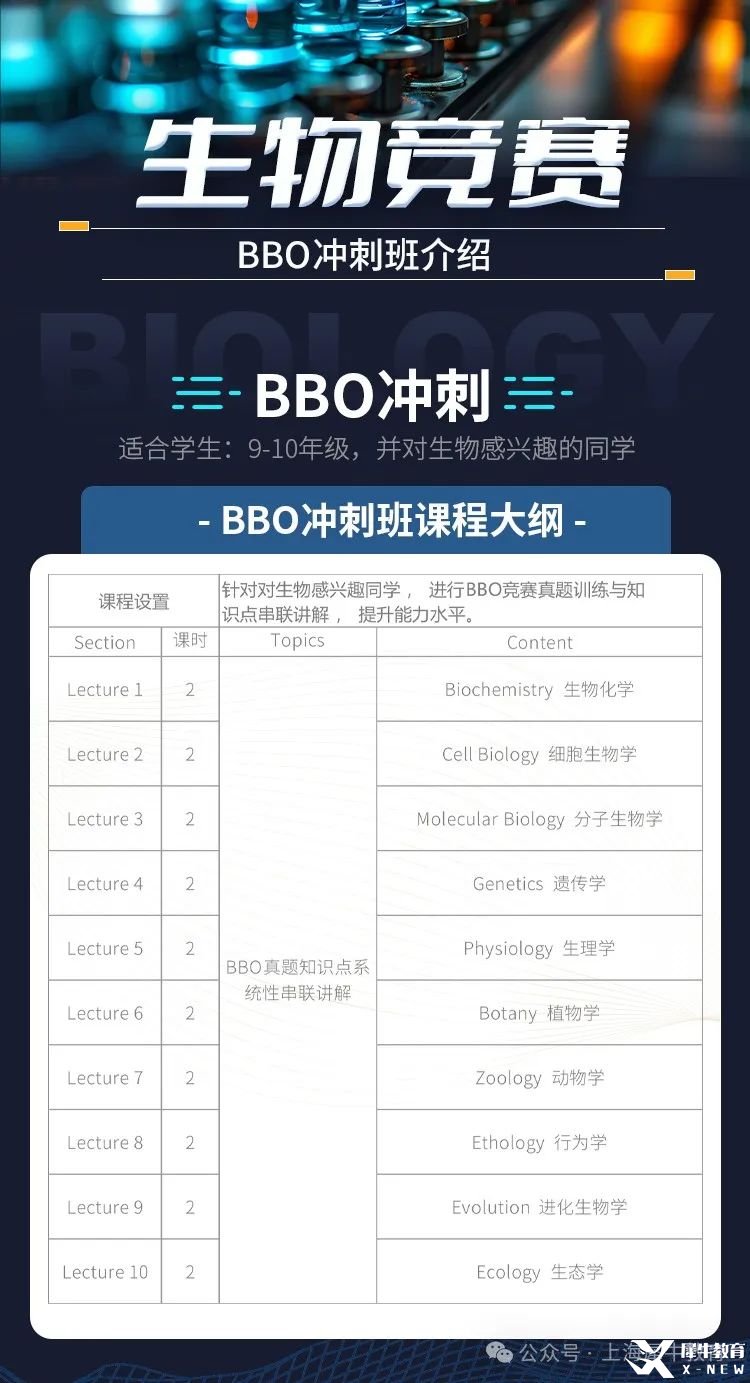 竞赛前1个月开设,以讲解BBO真题的方式串联知识点让没学过竞赛的学生最高效在短期掌握足够多知识,让已经系统学过竞赛的学生进行模拟训练与讲评学生随时可以插班。