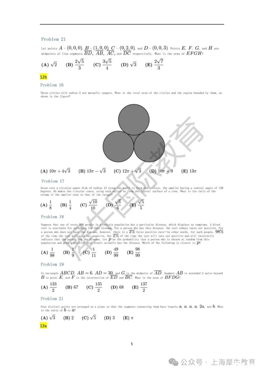 AMC10竞赛真题考察内容涵盖了初高中数学知识(除微积分外),难度相当于国内初中数学联赛,但略高于初中联赛,试题难度分布由易到难。