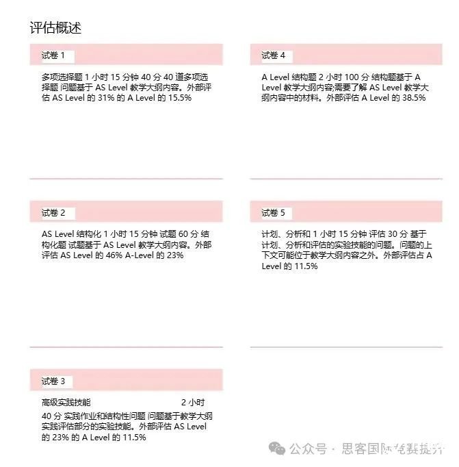 CIE考试局化学科目一共有五个Paper,Paper1、Paper2、Paper3是AS部分,学生必须同时报考3张试卷。Paper4、Paper5是A2部分,学生必须同时报考2张试卷。看考纲我们就可以知道,Paper1考理论选择题,Paper2和4是理论填空题,Paper3是实验实操而Paper5是实验设计试卷。