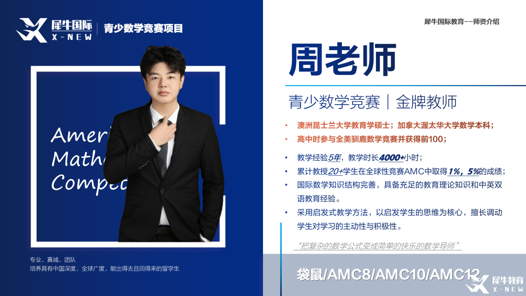 犀牛教育根据学生的基础以及目标,开设了不同的班型,对于3-5年级基础薄弱的同学,可以选择Pre-AMC8直通车,6-8年级基础扎实的同学,可以选择AMC8全程班。