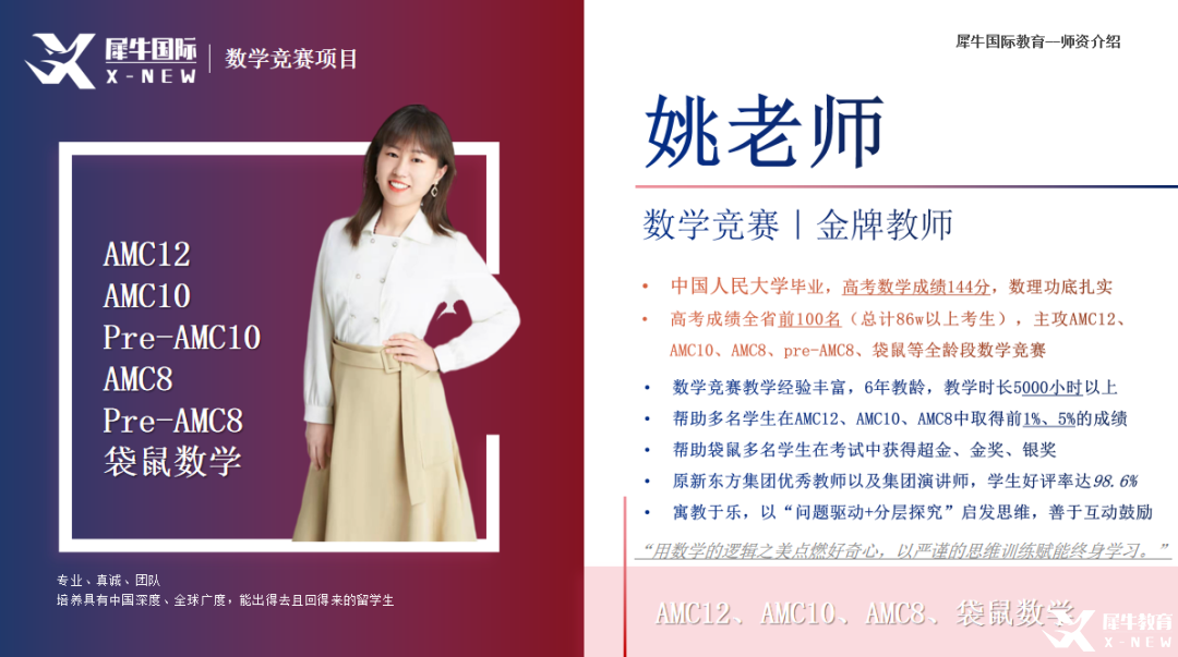 之所以教学成果显著,离不开各位大神老师的教研,犀牛AMC竞赛师资团队由海内外TOP学校的博士、硕士老师组成。