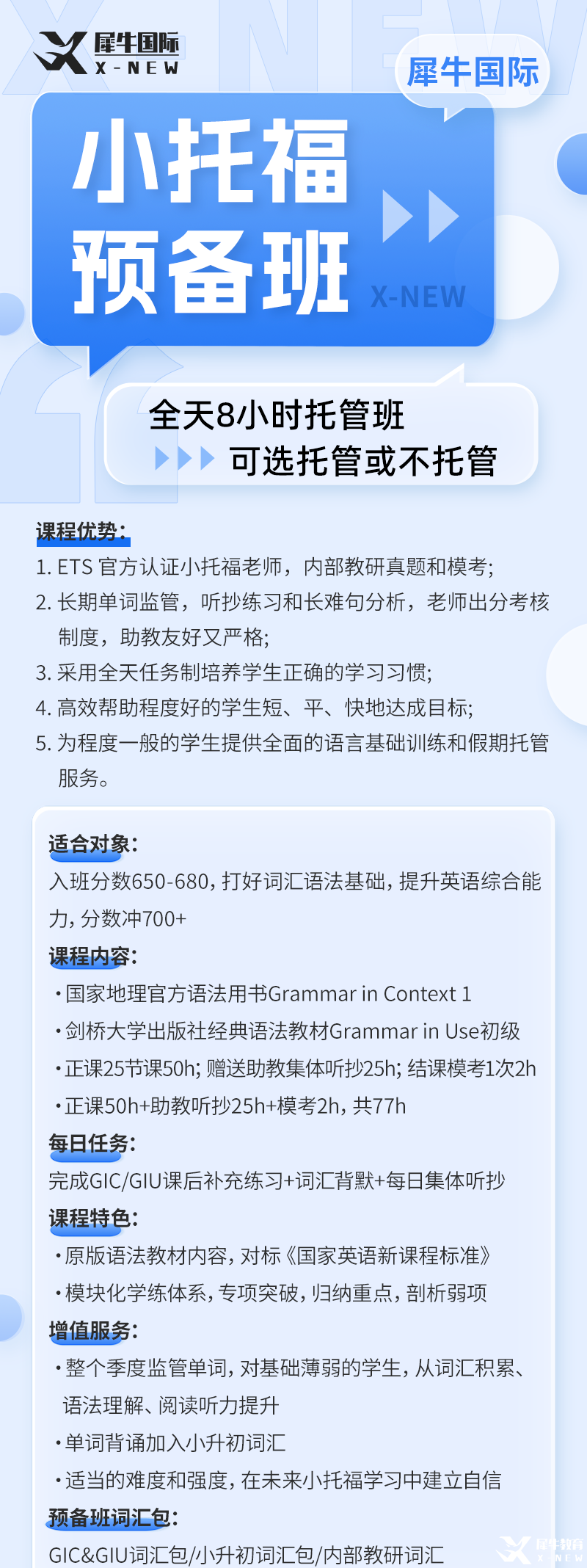 犀牛小托福培训课程包括小托福提能起跑班、小托福预备班、小托福基础班、小托福强化班、小托福冲分班等,⼀站式实现语⾔能⼒通关,目前犀牛小托福听起跑班、基础班和强化班设置如下: