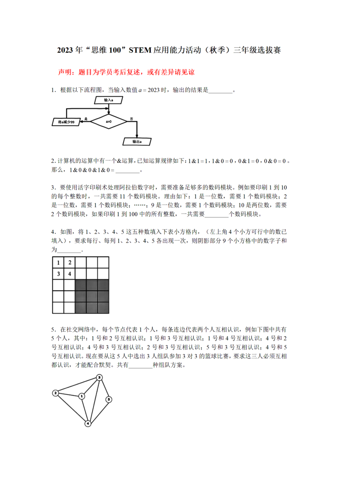 4、前两轮题目设置:思维100前两轮题目不存在编程算法内容。不过,在部分题目中,会以计算机的相关知识作为题目背景,例如流程图、条件判断、进制等,但解答这些题目无需编程基础,主要考察的仍是数学知识,学生只需在读懂题目的基础上运用数学工具即可。