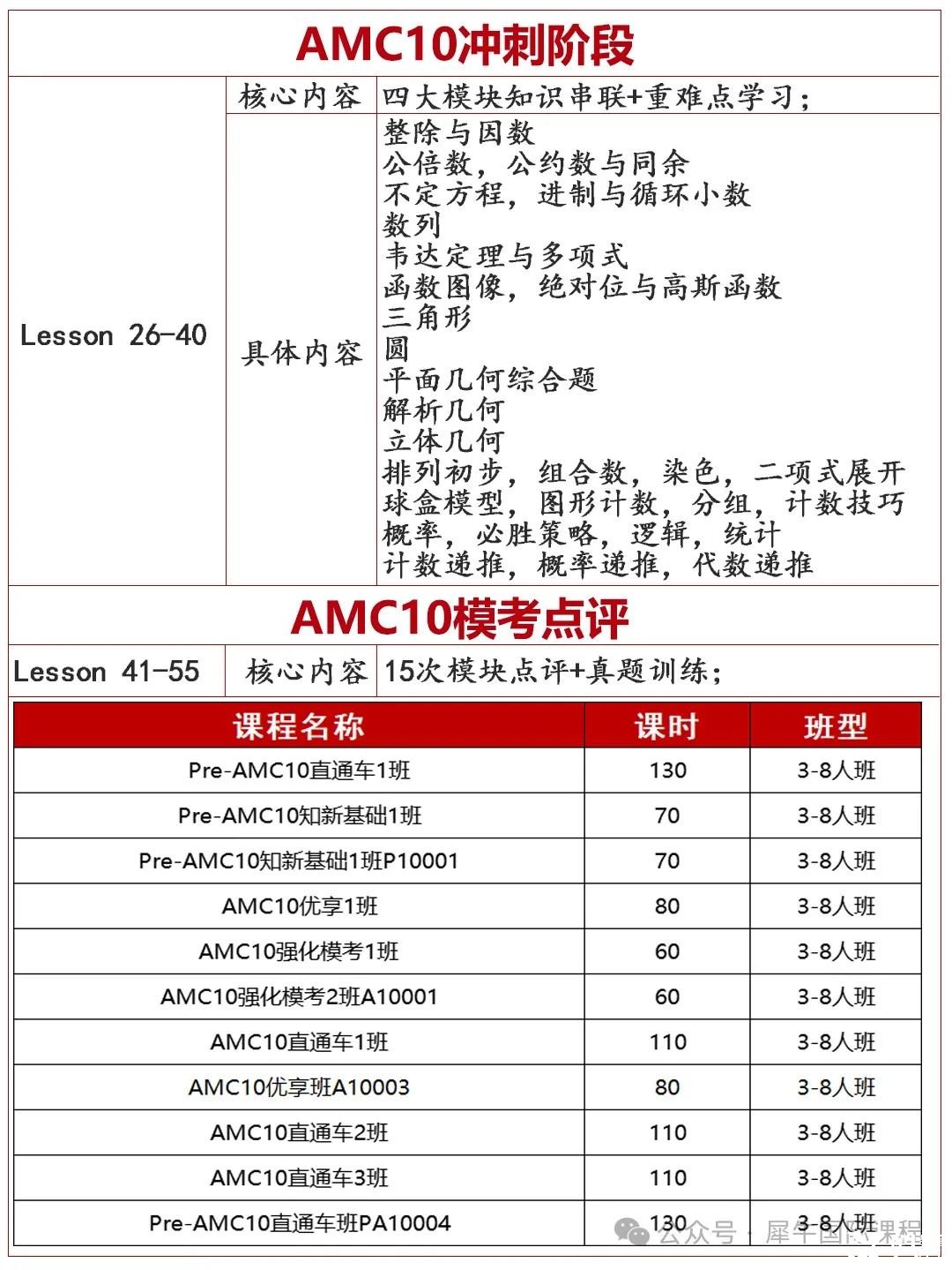 课程设置:犀牛开设PRE-AMC10全程班、AMC10基础班、强化班、冲刺班、全程班、模考点评班等班型;