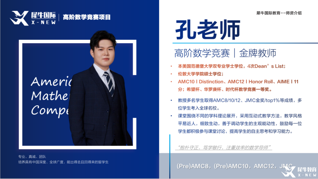 犀牛AMC12教学团队由顶级海内外高校毕业的博士、硕士组成,国际竞赛领域经验丰富,拥有多年教龄和丰富教学经验,均可纯英文或中英双语授课,能够提供针对性的指导,满足不同孩子学习需求,帮助无数学生斩获高分。
