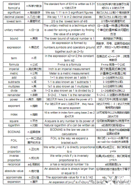 今天这份国际数学词汇中英对照表,包含了国际生常用的数学学科词汇,除了正常的中英对照外,还有词汇的例句,点击在线咨询领取~