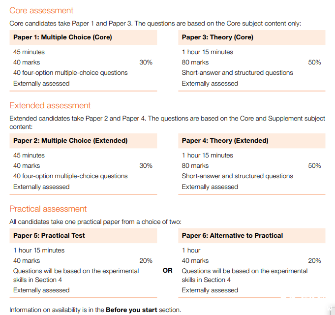 考试结构相同。核心考生考Paper 1和Paper 3.扩展考生考Paper 2和Paper 4.所有考生需选择Paper 5或Paper 6.