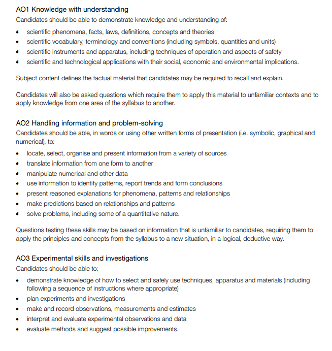 CIE考试局,IGCSE物理评估目标