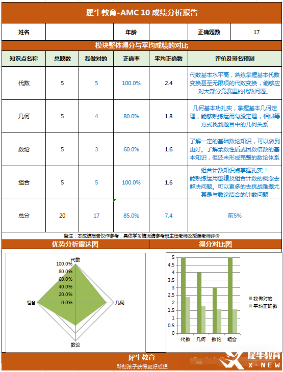 犀牛国际教育教研团队特别研发的AMC10竞赛前测试卷,根据测试结果,犀牛国际教育为学生量身定制 选择合适的班型,确保他们与老师的教学节奏保持一致~
