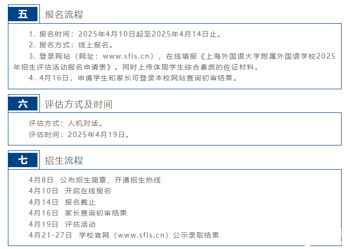 1.根据招生条件,符合条件的学生须在上海外国语大学附属浦东外国语学校网站进行登记。登记时间为:2025年4月10日至2025年4月 13日。学校网址为:https://www.msshw.pudong-edu.sh.cn/。