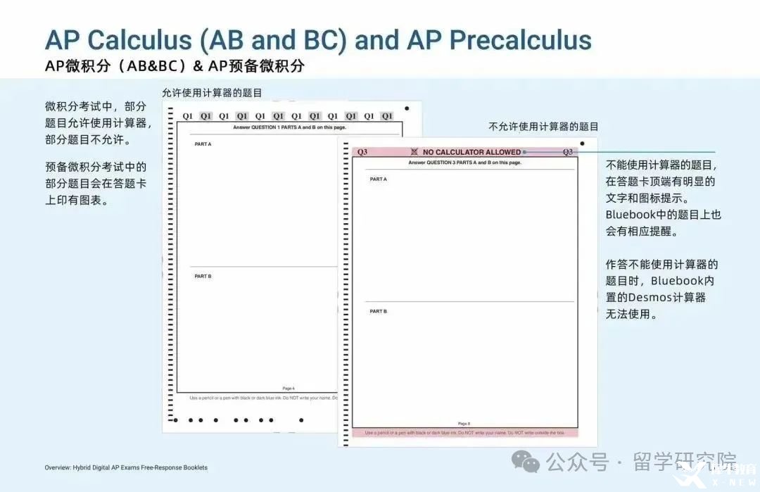 AP微积分的答题卡上会清楚标注哪些题目允许使用季璇玑,哪些题目不允许使用计算机。不能使用计算器的题目,在答题卡顶端有明显的文字和图标提示。Bluebook中的题目上也会有相应提醒。