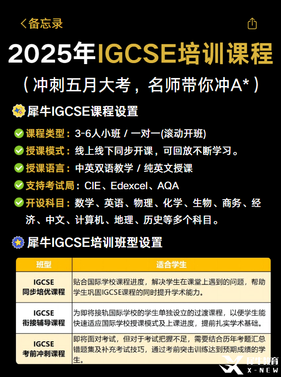 犀牛IGCSE课程辅导开设科目针对CAIE,爱德思 AQA三大考试局开设IGCSE课程全科全阶段培训OMO模式,满足不同学生的辅导需求!