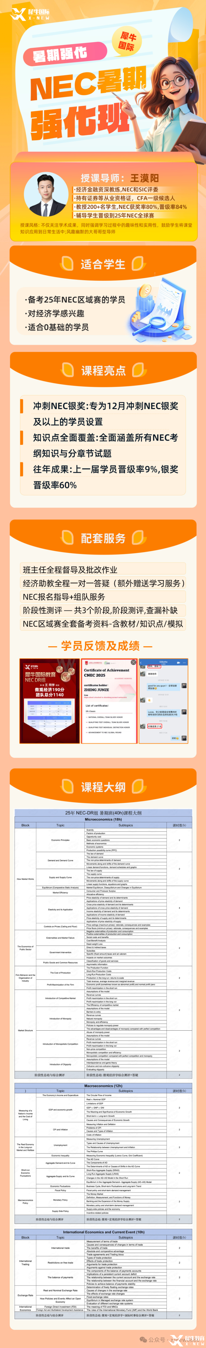 针对备考NEC竞赛的学生,犀牛专门开设NEC培训课程!想要学NEC/SIC/IEO/沃顿商赛的学生,犀牛开设经济商赛大师班,名师坐阵,带领学习深入学习!