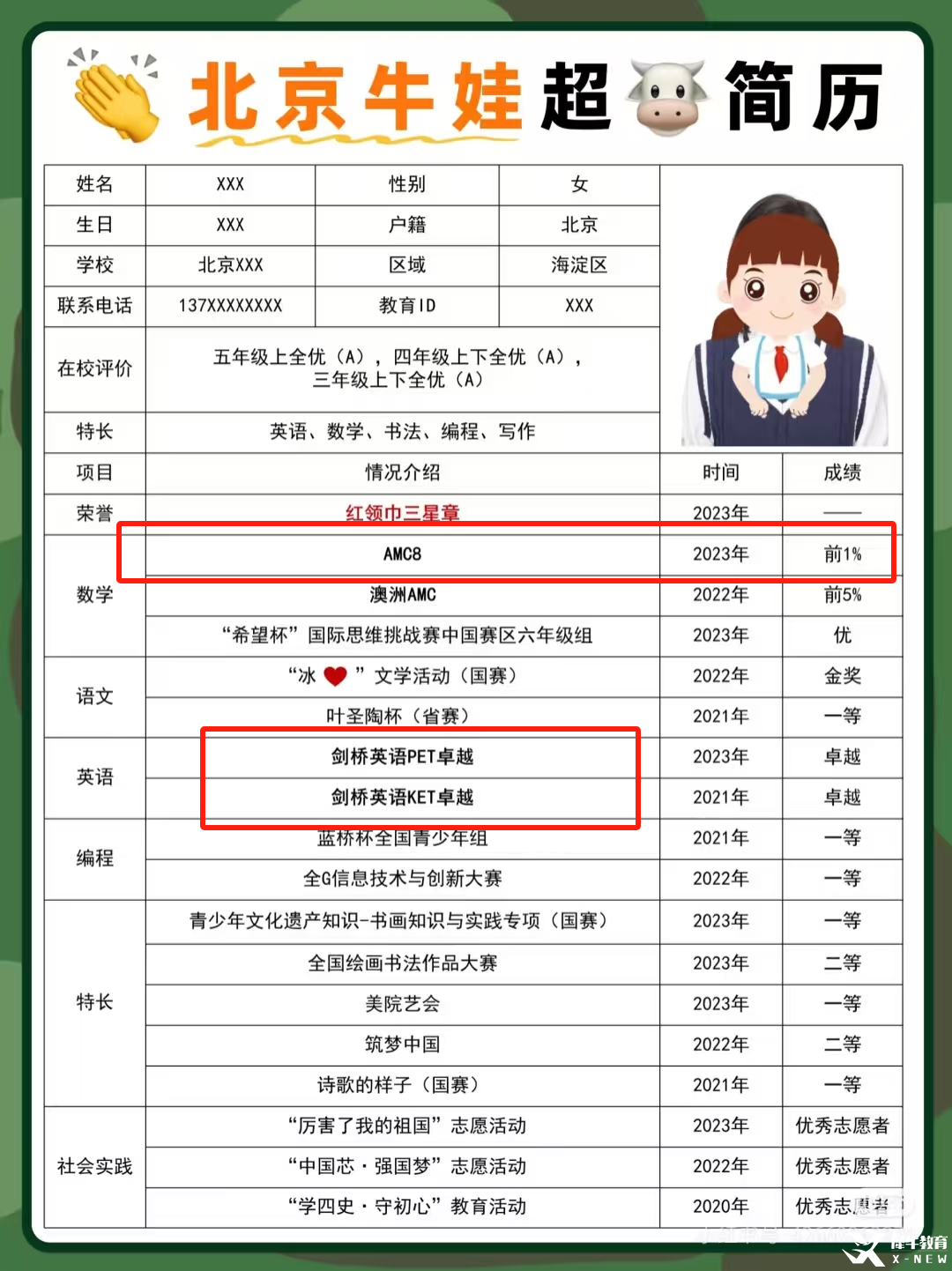 先来看下北京牛娃的超牛简历,可以看到AMC8竞赛,并且取得了全国前1%的优异成绩,除此之外。KET/PET等也都取得了优异的成绩,由此可见AMC8数学竞赛对于北京孩子的含金量还是非常高的,