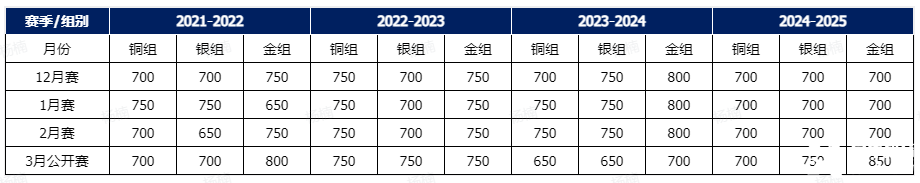 对比这几个赛季的晋级分数线,可以知道,晋级分数线一般在650-800之间浮动,并且3月份的公开赛晋级分数线一般比前几场月赛的要高一些(2023-2024赛季除外)。