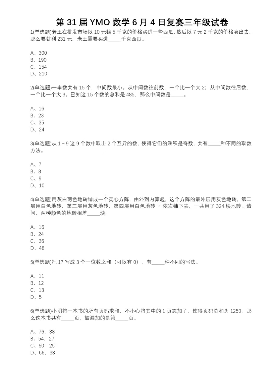 YMO数学竞赛三年级复赛历年试卷