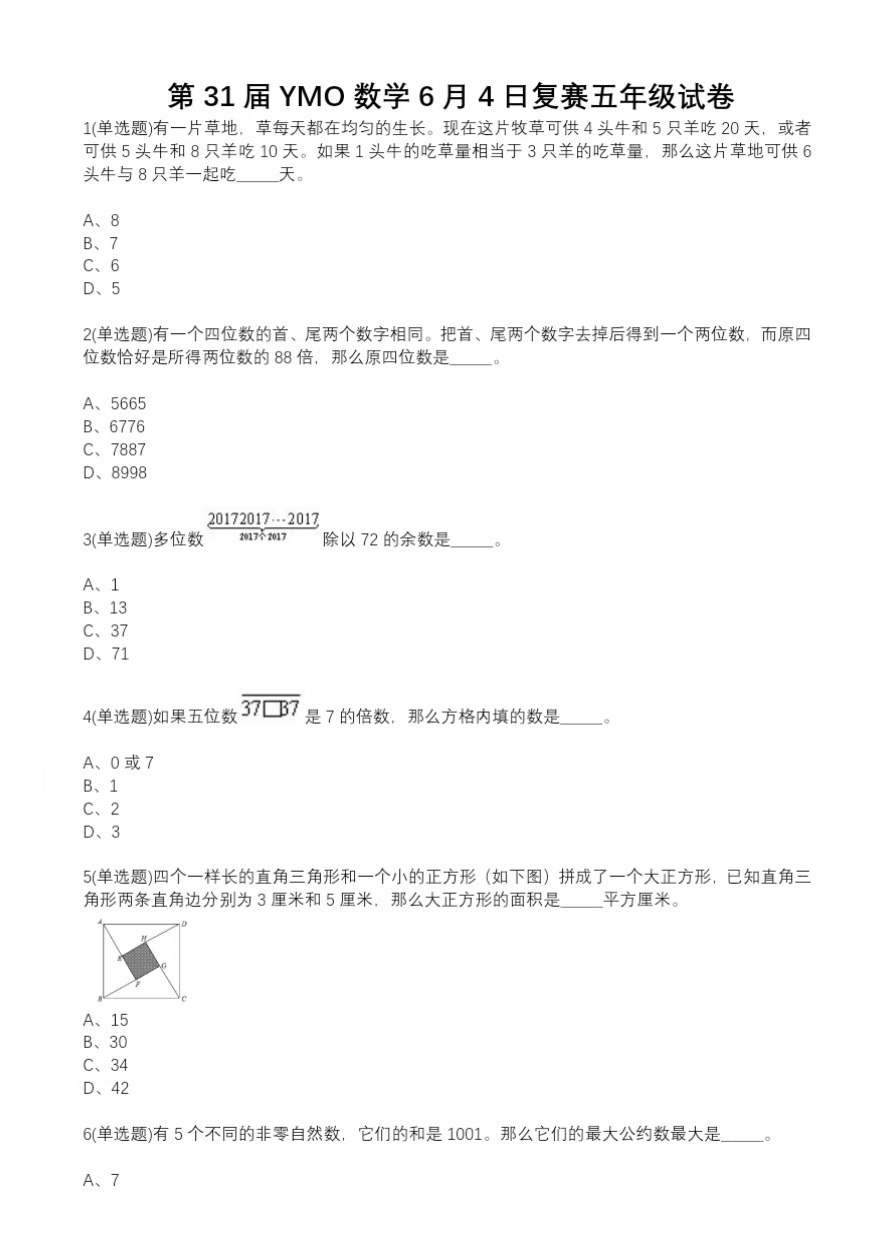 YMO数学竞赛五年级复赛历年试卷