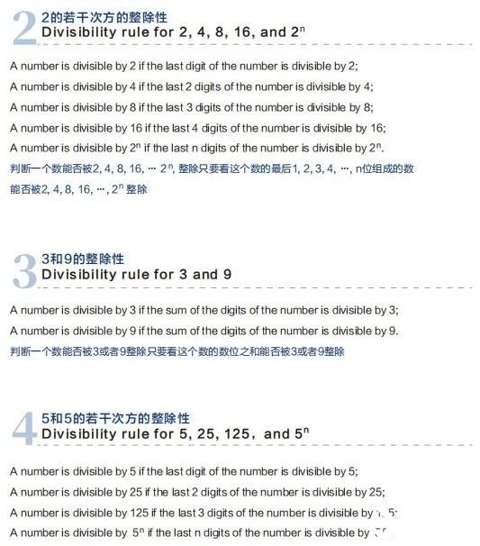 数论:奇数偶数、若干次方的整除、3和9的整除性、5和5的若干次方的整除性、11的整除性、有多于等于2种不同质因数的合数的整除性、分解质因数、最大公因数和最小公倍数