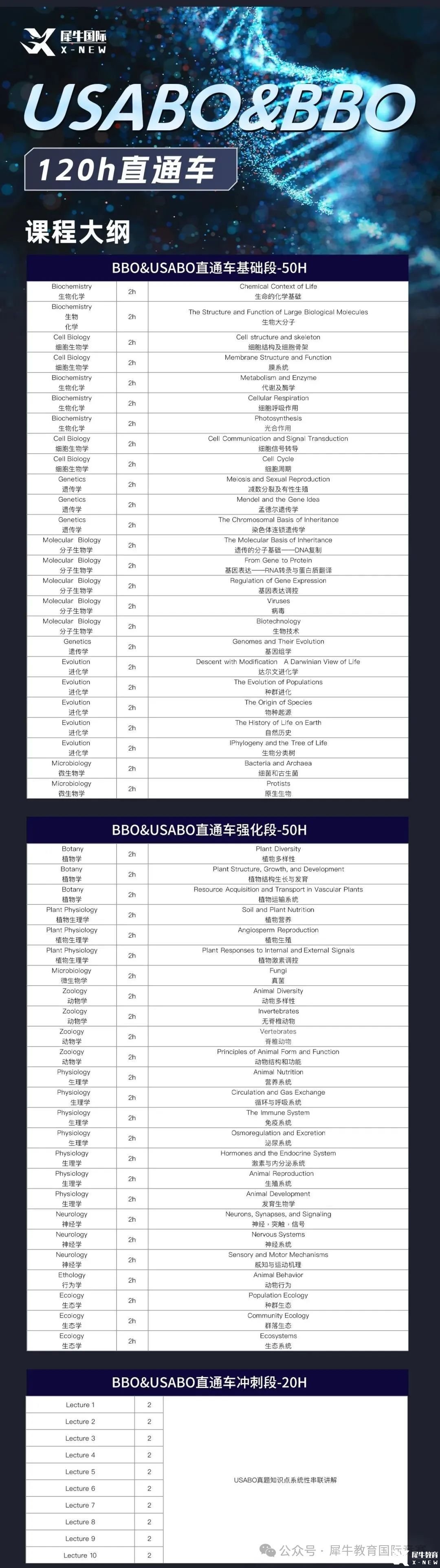 犀牛教育针对BBO&USABO竞赛推出多种班型,包含BBO全程班、USABO全程班、生物竞赛直通车课程、BBO暑期集训营以及USABO竞赛暑期集训课程。