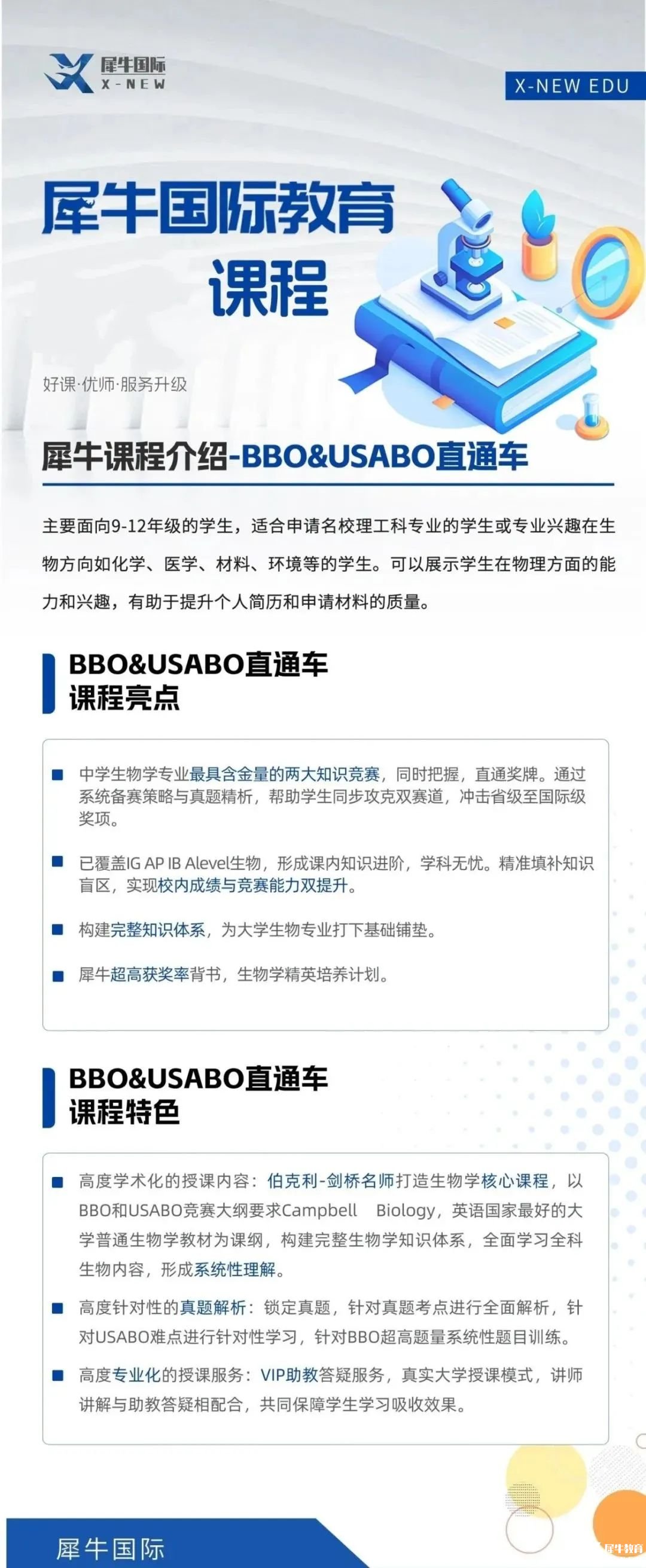 针对备考2026年USABO和BBO生物竞赛的同学,犀牛教育设置了USABO&BBO生物竞赛120h直通车,根据备考三阶段制定相应大纲,分基础班、全程班、冲刺班等,课程内容覆盖生物竞赛考试知识点。