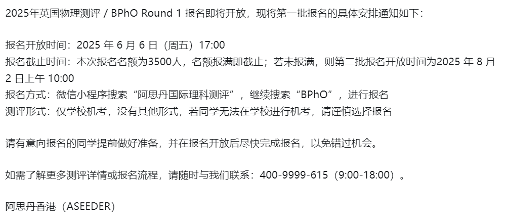 2025年BPHO报名名额中国区仅限3500个,第一批报名时间在明天6月6日开启!可以报名的学生抓紧时间啦!今天给大家全面介绍一下BPHO报名攻略!包括报名方式、报名流程及报名时间!一起看看~