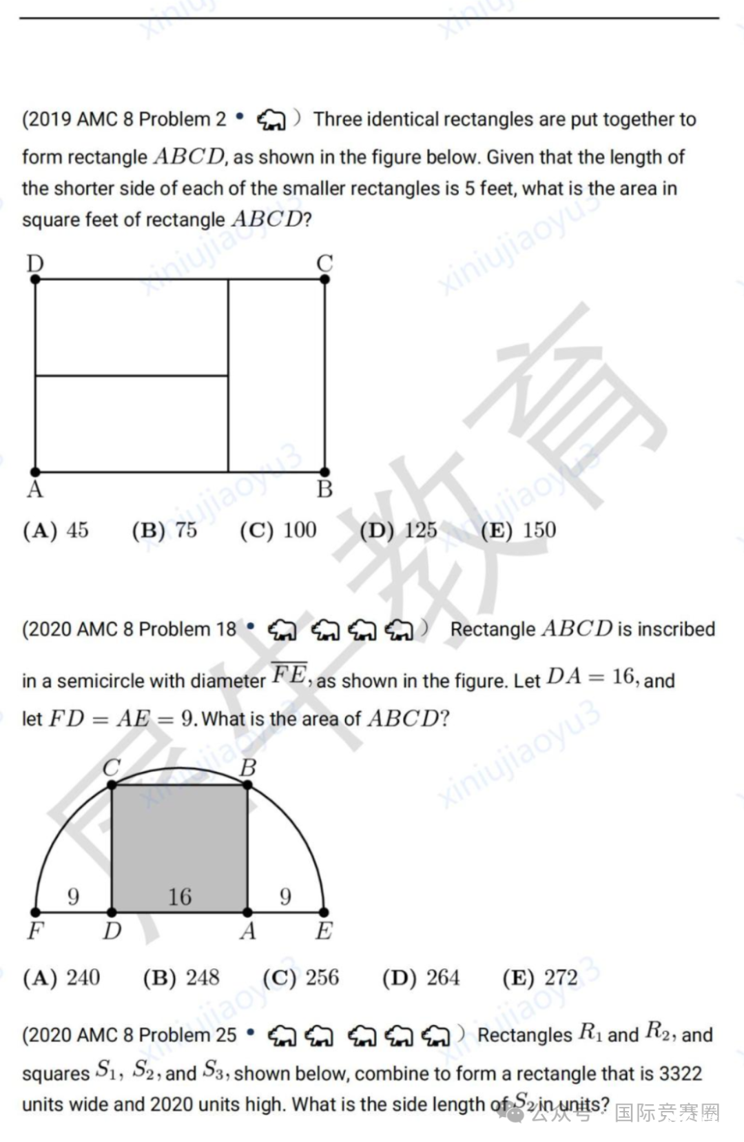 AMC8为8年级及以下学生设计,含25道选择题,涵盖数与运算、代数、几何、数论、组合数学等领域。
