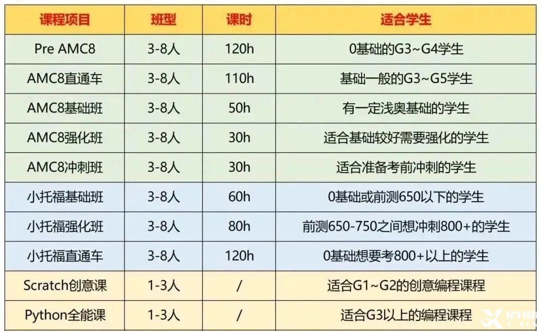 犀牛国际教育提供AMC8课程基础班、强化班、冲刺班、模考点评班、全程班等多种班型,3-8人小班/1对1模式,线上线下同步开课,根据学生基础情况定制匹配的课程学习,助力学生冲分拿奖。