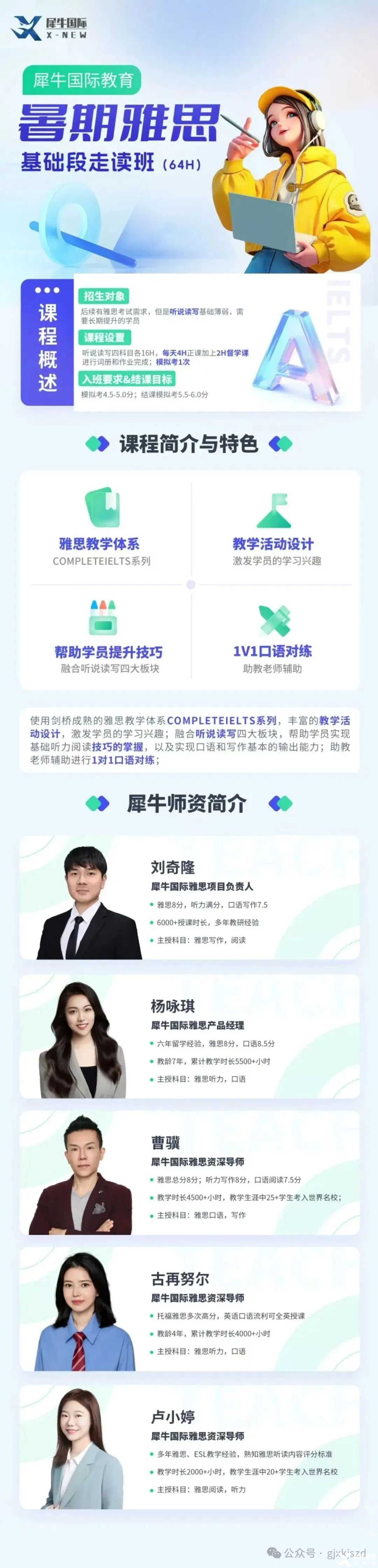 犀牛国际针对不同英语基础的同学开设有5.5分、6.5分班,以及专门的雅思夏令营课程,了解雅思课程详情可以添加老师微信(xnew101)咨询。
