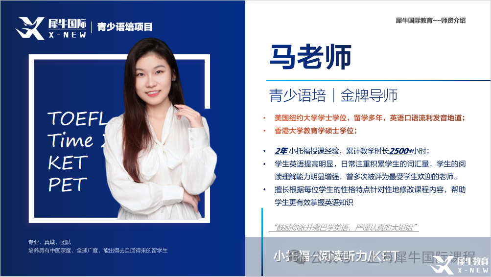 犀牛教育语培的各位老师毕业于国内外名校,在KET/PET/FCE/小托福/雅思/托福培训方面有丰富的经验!