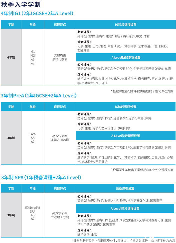 上实剑桥按照英美高中学制,共设四个年级G1、G2、A1、A2(由低到高),G年级平均修8-10门课程,A年级主修4-5门。